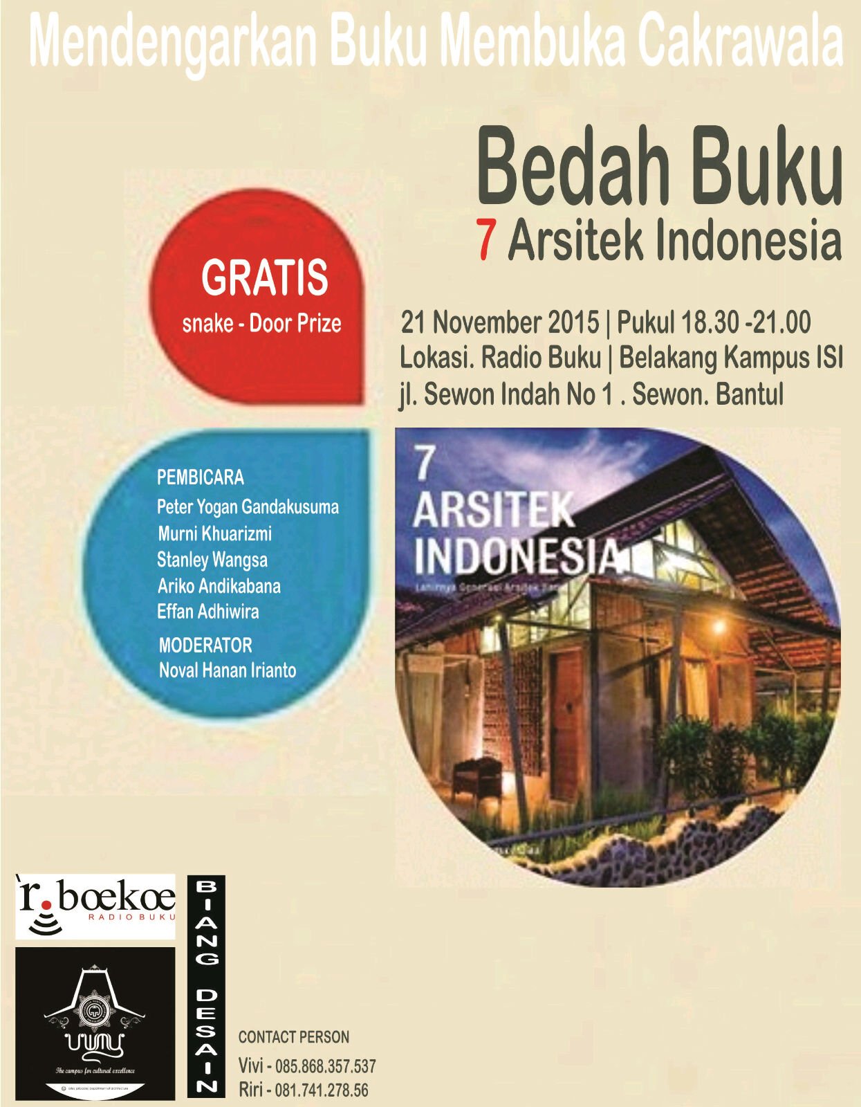 Bantul—Bertempat di halaman Radio Buku, diskusi buku tentang arsitek digelar (21/11/15). Buku tersebut berjudul 7 Arsitek Indonesia karya Peter Yogan Gandakusuma dan Murni Khuarizmi. Sesui judulnya, buku ini melibatkan 7 orang arsitek muda yang profil dan karyanya dimuat dalam buku tersebut. Mereka adalah Martin luqman Katoppo, Yu Sing, Gede Kresna, Effan Adhiwira, Ign. Susiadi Wibowo, Ariko Andikabina, dan Stanley Wangsa. Dua penulis dan tujuh arsitek yang terlibat direncanakan hadir dalam acara yang akan digelar mulai pukul 18.30 nanti.